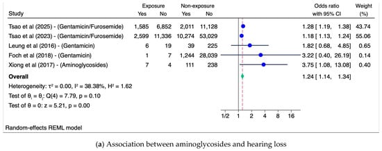 Our review has several limitations. First, we might have underestimated the associations between in-utero exposure to antibiotics and childhood hearing loss, particularly for non-aminoglycoside antibiotics, due to the limited number of studies reporting detailed timing and dosage of exposure and the inconsistent findings among these studies. Second, the absence of information on the severity of maternal infections complicates efforts to disentangle the potential interplay between infection-related factors and ototoxicity [45,55]. Third, significant heterogeneity across included studies limited the generalizability of our findings. Our findings likely reflect variations in study design, types and timing of antibiotic exposure, definitions of hearing loss, and sample sizes. Furthermore, of the eighteen included studies, only eleven specified the audiological tests used to diagnose hearing loss, and just seven provided clear definitions of hearing loss, which varied widely. This inconsistency hindered sub-analyses based on severity or phenotype and limited cross-study comparability.