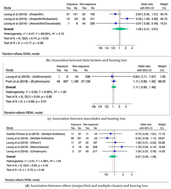 Subgroup analyses: Association between in-utero exposure to antibiotics use in pregnancy and childhood hearing loss [26,27,28,29,30,31]. Others*: sulfamethoxazole, trimethoprim, cefotetan, ceftriaxone, cephalexin, cefazolin.