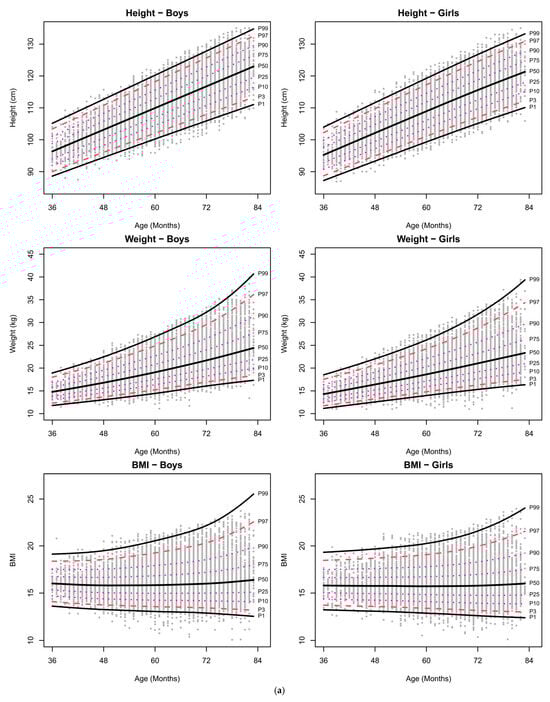 Age- and sex-specific percentiles, estimated using the GAMLSS method, are presented in Table 3 and Figure 3a,b. Table 3 provides the estimated sex-specific percentile values (1, 3, 10, 25, 50, 75, 90, 97, and 99) at key ages (36, 48, 60, 72, and 84 months). Figure 3a illustrates the percentile curves for anthropometric measurements, and Figure 3b displays the percentile curves for physical fitness measurements.