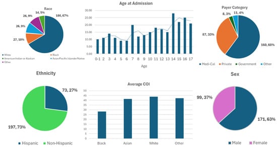 Patient demographics: race, age at admission, payer category, ethnicity, average COI, and sex. The dotted line demonstrates a trend-line of average age at admission.