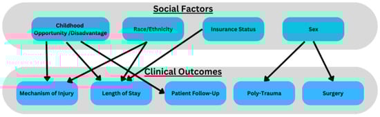 This study used a single-institution database to investigate the interplay between social factors and spinal trauma in pediatric patients. Lechtholz-Zay et al. demonstrate only one publication investigating how socioeconomic factors interplay with spinal injuries [1]. The study demonstrated, from a large public database, that mechanisms, patterns and injury severity had important associations with age, race and payor [11]. Our study demonstrates that ethnicity, sex, insurance status and SES (measured by COI/SDI) is associated with initial clinical presentation and subsequent clinical outcomes in pediatric patients with spinal trauma. We found COI and SDI to be effective metrics for social determinants of health and gauging clinical outcomes. For instance, patients from lower-deprivation areas (low COI, high SDI) were more likely to be Hispanic, have government-provided insurance (Medi-Cal), experience spinal trauma from violent mechanisms of injury, and have longer ICU length of stays. Our data align with national data that low socioeconomic status is associated with poorer trauma outcomes [4]. In contrast, patients from higher-SES backgrounds were more likely to sustain injuries from motor vehicle accidents or falls. These findings demonstrate associations with poor social factors and pediatric spinal trauma, where children from less fortunate backgrounds face a higher burden of severe injuries [12]. Given the significant interactions between social factors and clinical outcomes, we propose that pediatric spine trauma data/research can be conceptualized via frameworks of social determinants of health (Figure 2).