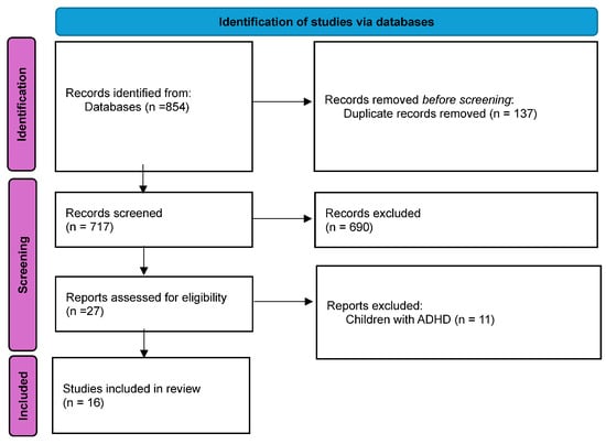 The database search yielded 854 articles, which was reduced to 717 after duplicates were removed as shown in Figure 1. The abstracts of the remaining articles were read by two authors who individually determined whether the articles met the criteria of inclusion. Differences in opinion were discussed, and consensus was reached. 27 articles met the inclusion criteria at this point. These articles were fully read by both authors individually, and 11 were excluded because they did not meet the criteria. In the end, 16 articles met the criteria and were included in the review.
