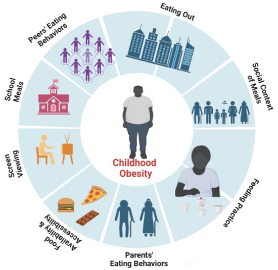The eating behaviors of peers can significantly influence children’s eating habits and contribute to the development of obesity. Studies have demonstrated that children tend to mimic the eating behaviors of their peers, particularly in social settings such as school or playgroups [83,84]. When children are exposed to peers who frequently consume unhealthy foods, such as sugary snacks or fast food, they are more likely to adopt similar behaviors, leading to increased consumption of calorie-dense, nutrient-poor foods [85,86]. This peer modeling effect plays a critical role in shaping children’s food preferences and overall dietary patterns, which can contribute to the risk of obesity.