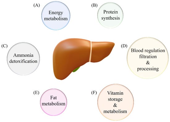 Functions of the liver. The liver’s functions are illustrated in circles and those include (A) energy metabolism, (B) protein synthesis, (C) ammonia detoxification, (D) blood regulation, filtration, and processing, (E) fat metabolism, and (F) vitamin storage and metabolism.