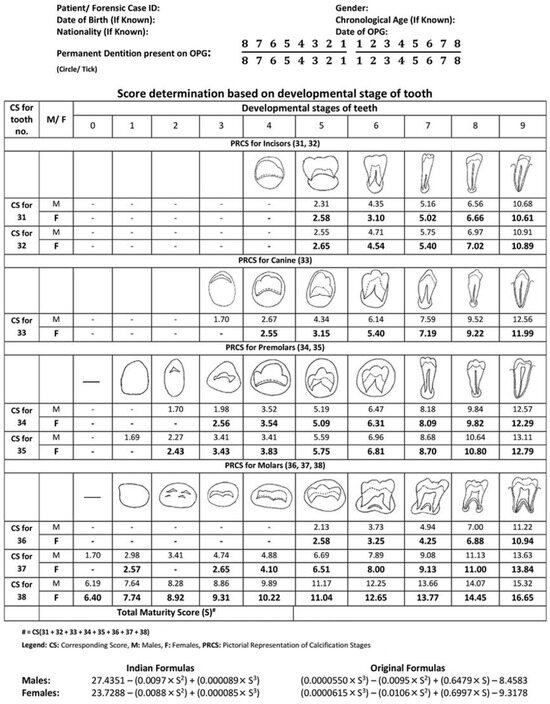 DA was primarily determined using the Demirjian method (DMet), which evaluates the crown and root development stages of teeth on OPGs [50]. Each patient was assigned a score based on Demirjian’s developmental chart (Figure 1).