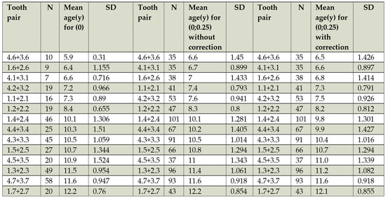 - Table 1: Comprehensive Chart for Dental Age Estimation*. Available online: https://www.researchgate.net/figure/Comprehensive-chart-for-dental-age-estimation_tbl1_311451996 (accessed on 11 February 2025).