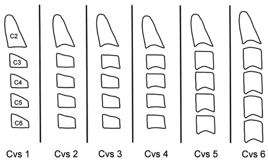Lceph images were analyzed to determine CVM, an indicator of skeletal maturity, based on the morphology of the first four cervical vertebrae. The CVM assessment followed Baccetti’s [49] method, which classifies skeletal maturity into six cervical developmental stages (CVM1–CVM6) based on the shape of the vertebral bodies and the presence of concavities on their lower borders (Figure 4), in order to anticipate the occurrence of the peak in mandibular growth, which is assumed to happen between CVM3 and CVM4. In the CVM1 stage, the lower borders of C2, C3, and C4 are flat, while C3 and C4 exhibit a trapezoidal shape, indicating that the growth peak is expected to occur in more than two years. In CVM2, a concavity appears on the lower border of C2, while C3 and C4 remain unchanged, suggesting that the growth peak is anticipated within approximately one year. As the skeletal maturity progresses to CVM3, concavities develop on the lower borders of both C2 and C3, and C3 and C4 transition into a trapezoidal or rectangular horizontal shape, signifying that the growth peak is imminent. In CVM4, concavities are present on the lower borders of C2, C3, and C4, with C3 and C4 taking on a rectangular horizontal shape, indicating that the growth peak has already occurred one to two years prior. At CVM5, at least one of C3 or C4 adopts a square shape while the concavities on all three vertebrae persist, suggesting that at least one year has passed since the peak of mandibular growth. Finally, in CVM6, one of C3 or C4 assumes a rectangular vertical shape, while concavities remain present, marking the end of the growth peak more than two years earlier [54].