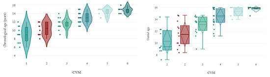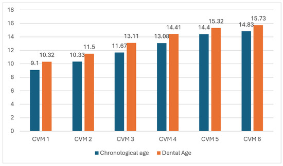 The CVM distribution by DA (DMet) is represented in Figure 3. The DA range for CVM 1 was 7 to 14 years, with a mean of 10.32 ± 2.21 years. The mean DA for CVM 2 was 11.5 ± 2.17 years, and for CVM 3, it was 13.11 ± 1.58 years. CVM 4 patients had a DA range of 11 to 16 years, with a mean of 14.41 ± 1.46 years. The mean DA for CVM 5 and CVM 6 was 15.32 ± 0.95 years and 15.73 ± 0.56 years, respectively.
