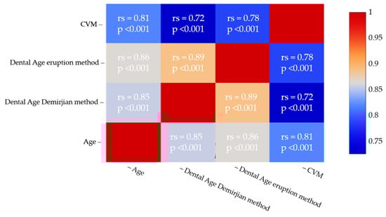 Spearman’s correlation test demonstrated a strong positive correlation between CVM and CA (rs = 0.81, p < 0.001). Significant correlations were also observed between CVM and DA (DMet: rs = 0.72, p < 0.001; CEMet: rs = 0.78, p < 0.001) (Figure 7).