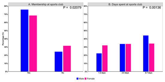 Next, it was assessed whether there were differences between sex groups and membership in sports clubs. The proportion of membership at sports club (p = 0.021) and more days spent at sports club (p = 0.0014) was higher in males than females (Figure 1).
