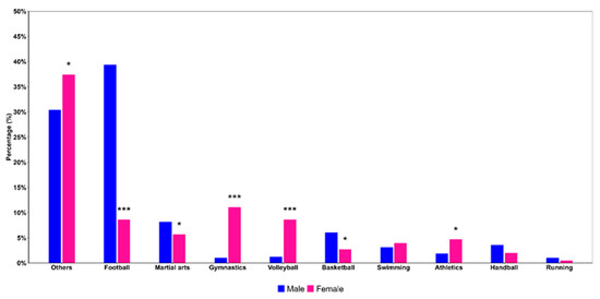 Sport activities stratified by type and sex. Differences between sex groups within each sport type were tested using the chi-square test. Statistically significant results are shown as *** (p < 0.001) and * (0.01 ≤ p < 0.05).