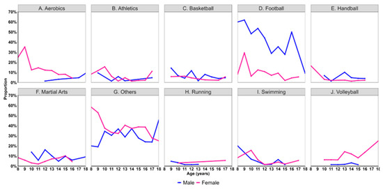 Sport activity participation by age and sex. (A) Participation in aerobics. (B) Participation in athletics. (C) Participation in basketball. (D) Participation in football. (E) Participation in handball. (F) Participation in martial arts. (G) Participation in other sport activities. (H) Participation in running. (I) Participation in swimming. (J) Participation in volleyball.