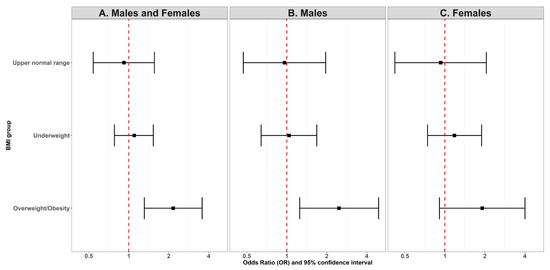 Membership to no sports club and weight status in pupils. Values are odds ratios (OR) and 95% confidence intervals based on univarite logistic regression, where normal weight pupils were considered as control group. The dashed line on the forest plots represents the point of no effect (OR = 1). (A) Odds ratios in males and females. (B) Odds ratios in males. (C) Odds ratios in females.