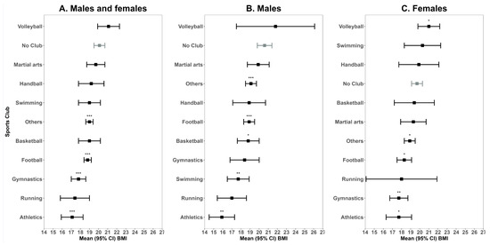 Mean (95%) BMI in pupils by type of sport club membership. Mean values are compared against the control group “No Club” (gray) indicating no membership to any sports club. Significant differences are shown as p < 0.0001 (***), p < 0.001 (**), or p < 0.05 (*) and are based on univariate linear regression models. (A) Odds ratios in males and females. (B) Odds ratios in males. (C) Odds ratios in females.