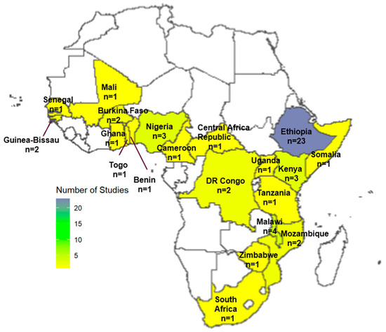 Of the 53 included studies, the majority (n = 35, 66.0%) were sub-national, focusing on specific regions within countries, while 18 studies were conducted at the national level. A significant proportion of studies were conducted in Ethiopia (n = 23, 43.4%), followed by Malawi (n = 4, 7.5%), Nigeria (n = 3, 5.7%), and Kenya (n = 3, 5.7%). Figure 2 illustrates the geographical distribution of the included studies by country.