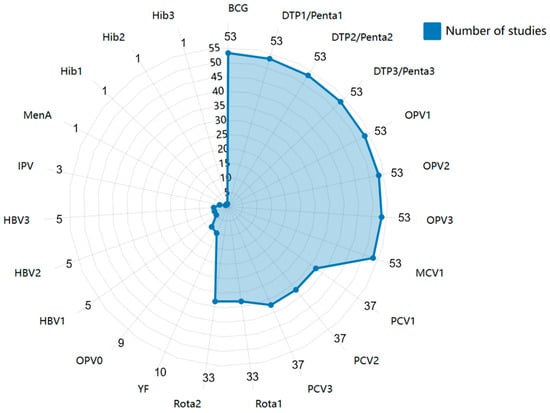 The most commonly assessed vaccines for VSC among children aged 12–23 months in SSA are BCG, DTP/Penta (first, second, and third doses), OPV (first, second, and third doses), and MCV1. In contrast, Meningococcal A (MenA) and Haemophilus influenzae type b (Hib) were the least studied antigens. Only nine studies (17.0%) included the birth dose of OPV (OPV0) in their VSC measurement, despite all 20 countries recommending OPV0 in their National Immunization Programs (NIPs) (Figure 3).