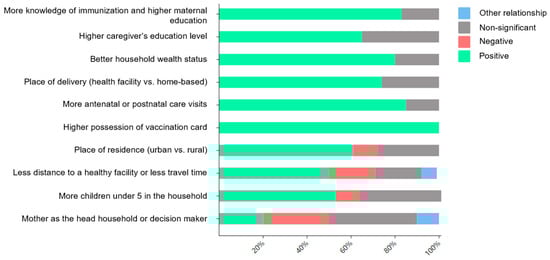 Figure 4 illustrates the relationship between these factors and VSC. Higher VSC rates were most strongly associated with (i) greater knowledge of immunization and maternal education (15/18, 83.3%); (ii) higher caregiver education level (14/22, 63.6%); (iii) better household wealth status (15/19, 78.9%); (iv) health facility-based deliveries (14/19, 73.7%); (v) increased antenatal/postnatal care visits (16/19, 84.2%); (vi) possession of a vaccination card (5/5, 100%); urban residence (11/18, 61.1%); (vii) distance to a healthy facility or travel time (7/14, 50%); and (viii) number of children under five in the household (10/19, 52.63%).