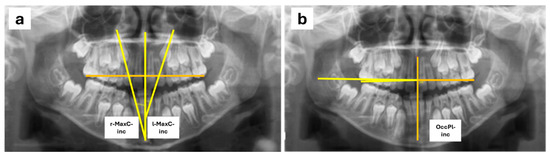 For the measurements, a reference plane was set up using the midline passing through the midpoint of the palatal suture and the anterior nasal spine. To assess MaxC-inc, the angle between the reference plane and a line following the longitudinal axis of the maxillary canines was measured (Figure 1a) following the Power–Short and Canut techniques [30,31]. For the measurement of OccPl-inc, the occlusal plane was defined by drawing a line passing through a point at the center of the occlusal surface of the permanent first maxillary molars or, if the permanent molars had not yet erupted, the second maxillary primary molars. A line perpendicular to the reference plane was drawn at the point where it intersected the occlusal plane on the right side of the patient, and the angle formed between this perpendicular to the midline and the occlusal plane was measured (Figure 1b). Also, right (r-) and left (l-) sides were evaluated.