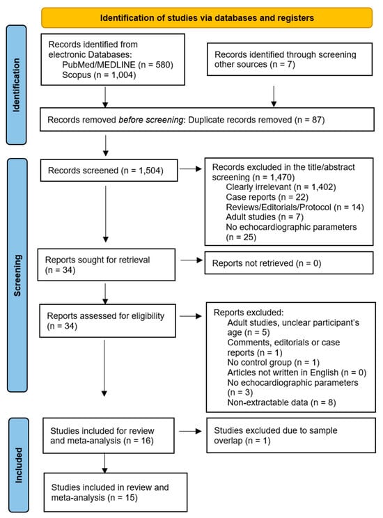 The study selection flowchart is presented in Figure 1. Initially, 1591 records were identified in total, and after duplicate removal, 1504 studies remained. Of these, 1470 were excluded as irrelevant, based on abstract or title screening. Full-text access was available for all remaining 34 studies, and another 18 out of the 34 studies were further removed following the exclusion criteria. Therefore, 16 studies were eligible for the meta-analysis, and after the exclusion of one study [15] due to sample overlap, 15 studies were included. The echocardiographic parameters measured from each study (mean value and standard deviations) are provided separately in Supplementary Table S1.