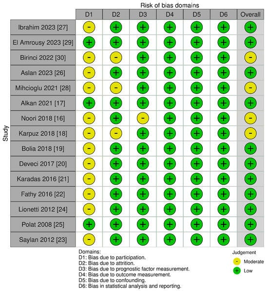 Assessment of the risk of bias (RoB) in the included studies was conducted by two reviewers independently, using the Quality in Prognosis Studies (QUIPS) tool [10]. This tool was developed to assess the risk of bias in the results of non-randomized studies, recommended by the Cochrane Prognosis Methods Group. QUIPS consists of six important domains: (1) The risk of selection bias; (2) The risk of attrition bias; (3) The risk of measurement bias related to how the prognostic factor is measured; (4) The risk of bias related to the measurement of the outcome; (5) Bias due to confounding; (6) Bias related to statistical analysis and presentation of the results. Studies were classified as low risk, if only up to one domain was considered moderate and as high risk if at least one domain was considered high or three or more domains were considered moderate [11]. The visualization of the assessment was performed using the robvis tool [12]. Any disagreements were resolved with the final decision of a third senior reviewer.