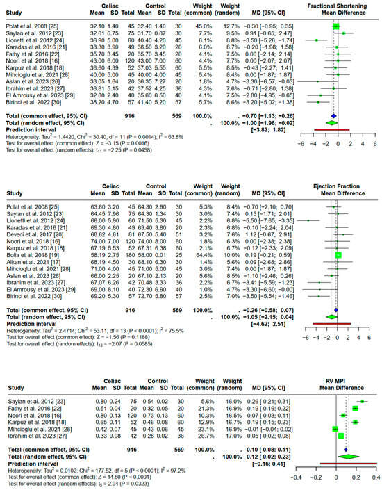 The forest plots in Figure 3 illustrate the pooled effect sizes for all the included studies, showing the degree of heterogeneity and the effect of celiac disease on each echocardiographic parameter. The size of the squares indicates the weight of each study, and the horizontal lines represent the 95% confidence intervals. In the majority of studies, there is a positive association between celiac disease and myocardial dysfunction (as determined by the mean difference of each echocardiographic parameter between celiac patients and controls).