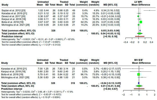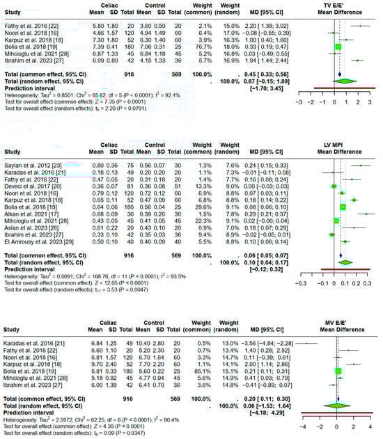 In addition, adherence to a gluten-free diet did not have any impact on the RV MPI index (p = 0.22, pooled effect of three available studies) or the LV MPI index (p = 0.31, data collection of six studies). Finally, according to the random effect models, TV E/E’ and MV E/E’ did not differ statistically between celiac disease patients who were on GFD (p = 0.17 and p = 0.93, respectively).