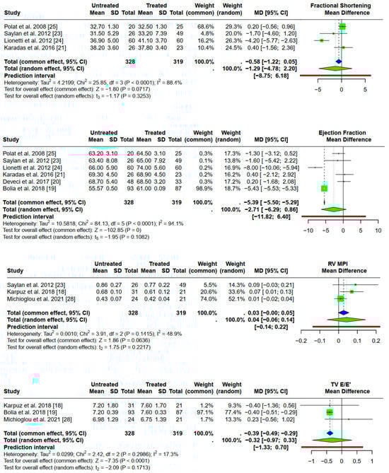 The myocardial performance index, also known as the Tei index, is considered a non-invasive parameter that may offer valuable insights into myocardial function in adults. It provides useful information about the overall function of the myocardium that can reveal myocardial abnormalities before they are detected by conventional echocardiography (EF or FS) [13]. In adults, a higher MPI value indicates poorer cardiac function in various heart diseases, such as heart failure and cardiomyopathy. The use of MPI in children and adolescents is still under investigation, and no established normal values for this group exist, limiting the wide use of MPI in daily clinical practice. Although the relationship between MPI and clinical outcomes in this population requires further validation, higher MPI values, even in children, are often associated with impaired myocardial function [13]. Finally, in our meta-analysis, although MPI does not seem to be a clinically attractive parameter, the comparison between patients and controls is valuable, incontrovertible, and enhances interpretability, especially in cases where a non-invasive assessment is required.