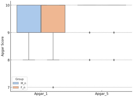 The Apgar_1 score was 9.63 ± 0.57 for the M_n group and 9.40 ± 0.65 for the F_n group. The Apgar_5 score was 9.88 ± 0.39 in the M_n group and 9.90 ± 0.38 in the F_n group. All groups exhibited a non-normal distribution of data (Shapiro–Wilk test, p < 0.001). The Mann–Whitney test for the group comparisons indicated a significant difference at 1 min (p = 0.010) but not at 5 min (p = 0.581), as shown in Figure 2.