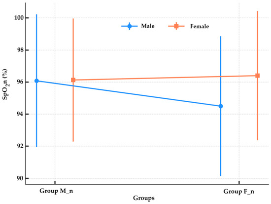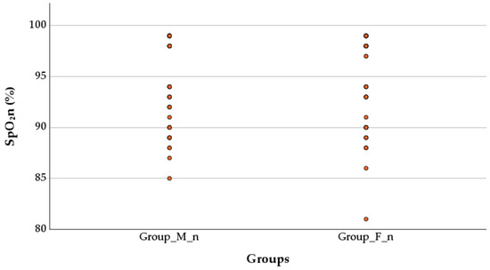 The SpO2n values after birth in newborns were non-significantly higher in the M_n group compared to the F_n group (96.11 ± 3.94 vs. 95.45 ± 4.28, p = 0.115, Mann–Whitney test), as shown in Figure 4.