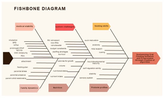 Fishbone Diagram: Visual representation of these factors, serving as a foundational step in addressing the challenges and streamlining the process to enhance the care of preterm infants during their oral feeding development.