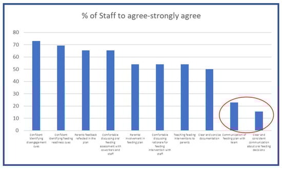 Staff satisfaction surveys completed in 2020, during the COVID-19 pandemic, revealed that stress and anxiety increased due to the inconsistencies in initiating and advancing oral feeds. Additionally, staff expressed dissatisfaction with various aspects of the process, including the development of feeding plans, communication within the healthcare team, responsiveness to feedback from parents and staff, as well as the documentation of these crucial elements. As illustrated in Figure 2, staff did not feel the oral feeding plan was well communicated with the rest of the team or that there was consistent communication surrounding oral feeding decisions.