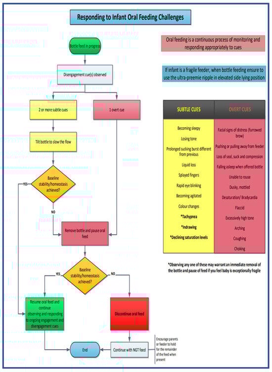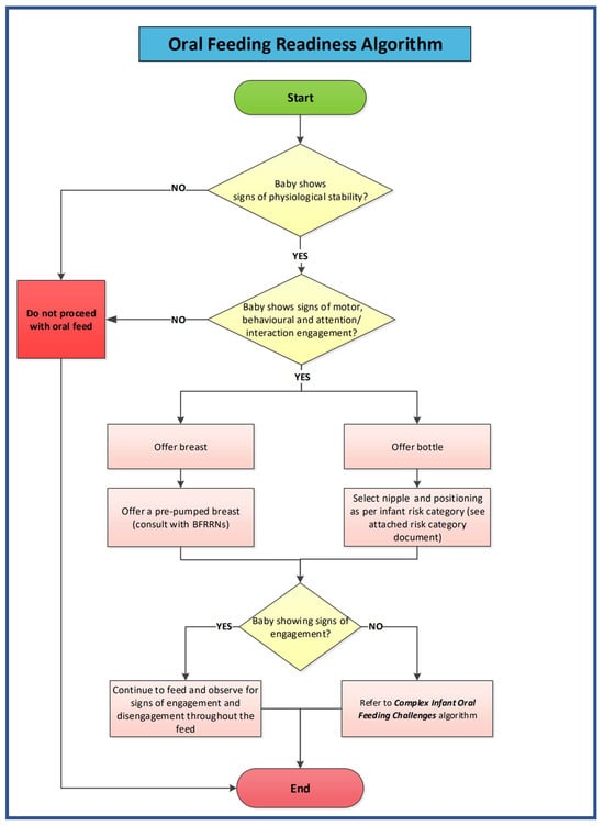 Crucially, both algorithms emphasized that oral feeding is an ongoing process that requires continuous monitoring and the care provider’s close attention to recognize and respond to the infant’s feeding cues, whether they are signs of engagement or disengagement [24,29].