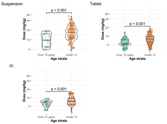Patients less than 13 years old required significantly higher doses (per kilogram body weight) than patients older than 13 years (Table 3, Figure 2). Note that the values presented describe the entire dataset without accounting for the correlated nature of the data (i.e., measurements from the same patient are more closely correlated than those from different patients). Consequently, these results should be interpreted as a general representation of plasma concentration values when active efforts are made to maintain plasma concentrations at a specific level. In general, the use of the IV formulation was associated with the highest proportion of target plasma concentrations between 0.7–2.0 mg/L (65.8% of samples), followed by the DRT (49.4%) and POS (33.3%) formulations.