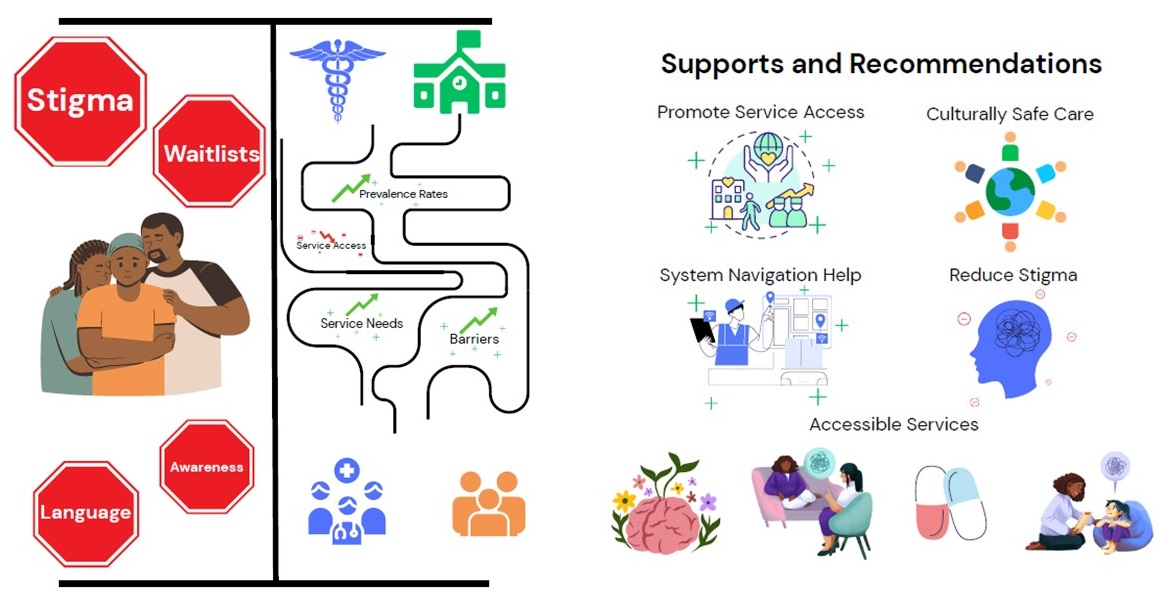 Children with prevalent mental health (MH) and neurodevelopmental disorders and their caregivers are at risk of increased psychological stress [1]. Neurodevelopmental disorders (NDDs) affect 14% of children worldwide, with an estimated prevalence of 9.5% for Canadian children [2]. Additionally, about 20% of Canadian youth report mental health challenges, including anxiety and mood disorders [3,4]. Children diagnosed with NDDs/MH report significant challenges in academic performance, social interactions and family dynamics [5,6]. Despite the increase in prevalence and awareness, there remain significant gaps in understanding if these rates represent all Canadian youth, including racialized children. Given that approximately 37% of children in Canada are a child of an immigrant, with this number expected to be closer to 49% by 2036 [7,8], it is important to understand the prevalence of NDDs/MH, service needs and barriers to service access in Canadian children of immigrants.