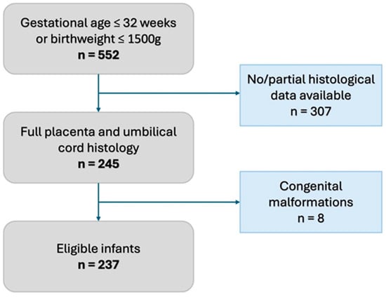 We conducted a single-center retrospective observational study in a tertiary Neonatal Intensive Care Unit of the Baross Street Department of Obstetrics and Gynecology, Semmelweis University, Budapest, between January 2020 and December 2022. According to our institutional protocol, every preterm infant born ≤ 32 gestational weeks or with a birthweight ≤ 1500 g receives a complete placenta and umbilical cord histopathological evaluation based on the APWGCS guideline. We excluded neonates who did not have a complete histopathological evaluation and those who were born with congenital malformations (Figure 1).