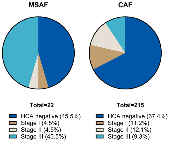The proportion of histological chorioamnionitis (HCA) stages in the meconium-stained amniotic fluid (MSAF) and clear amniotic fluid (CAF) groups.