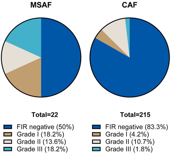 The proportion of fetal inflammatory response (FIR) stages in the meconium-stained amniotic fluid (MSAF) and clear amniotic fluid (CAF) groups.