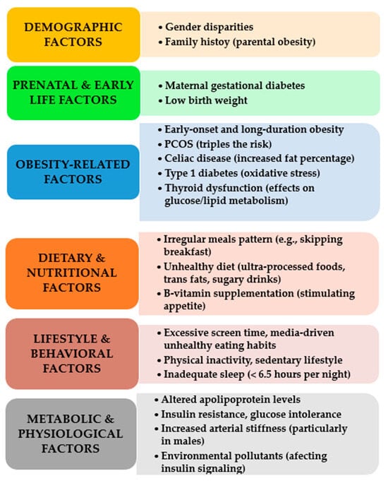 The primary risk factors for paediatric MetS were identified through various studies, systematically categorized, synthesized, and are presented in Figure 1 [,,,,,,,,,,,,].