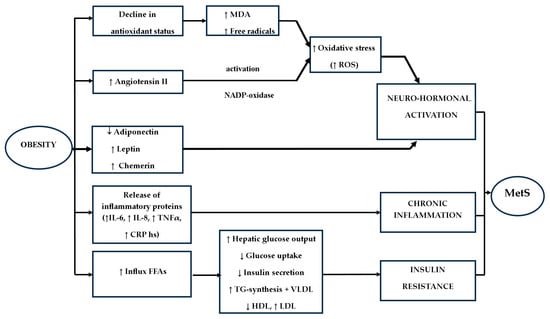 Avelar et al. (2015) have noted the potential involvement of oxidative stress in the development of MetS, often associated with a decline in antioxidant defences []. Investigations focusing on malondialdehyde (MDA) levels have detected elevations in this marker and free radicals among obese individuals, suggesting that oxidative stress plays a role in the pathophysiology of MetS—Figure 2. Oxidative stress also exerts an impact on insulin sensitivity, thereby contributing to an increased risk of developing T2DM. Disruptions in the production of reactive oxygen species (ROS) escalate lipid peroxidation, promoting a pro-inflammatory milieu and raising the risk of atherosclerosis. An elevated concentration of nicotinamide adenine dinucleotide phosphate (NADPH) oxidase is further linked to oxidative stress and the risk of atherosclerosis, hyperglycemia, and the pro-inflammatory state associated with MetS, leading to its overactivation [].