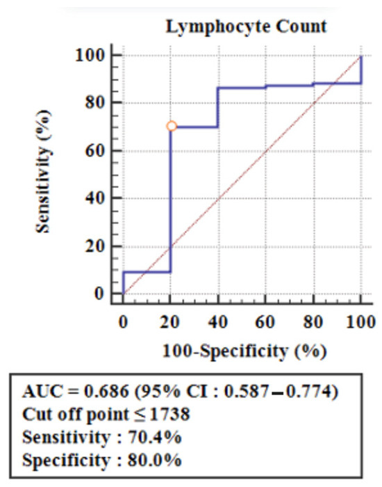 Statistical analyses were conducted using the Chi-square test, Student’s t-test, and Spearman rank correlation, with significance defined at p < 0.05. ROC curve analyses were performed to determine the cut-off point for lymphocyte counts, utilizing SPSS Windows version 24.