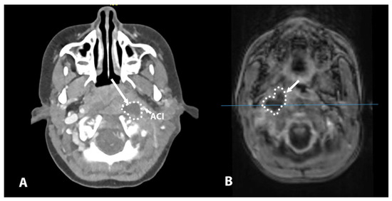 (A) CT scan showing a collection medial to the vascular structures (ACI) on the left side. (B) MR scan showing a collection medial to the vascular structures; note inferior image quality due to the child’s movement during the scanning procedure, despite sedation. In these cases, the route to the collection was achieved through the pharynx to avoid injury to the vessels. ACI—internal carotid artery.