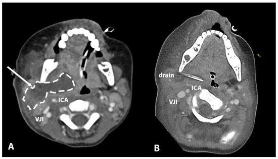 The management of DNSIs in children is distinguished by its emphasis on securing the airway. In this study, the airways of all patients were evaluated by a multidisciplinary team comprising otolaryngologists, pediatric intensivists, and anesthesiologists. Intubation under controlled conditions was performed in patients whose airways were significantly compromised, ensuring safety during imaging or the surgical intervention. Some patients remained intubated after the initial procedure due to several reasons: impending airway compromise and the repeated dilatation of the surgical access point. It is impossible to assume that the child will comply with the repeated dilatation of the surgical drainage access point in the subsequent 24 h. Extubation was performed when the patients met the following criteria: (1) no airway compromise; (2) negative dilatation of the surgical access point; and (3) decreasing inflammatory parameters (CRP, leukocytosis, procalcitonin). In this series, the duration of intubation was between 24 h and 6 days.