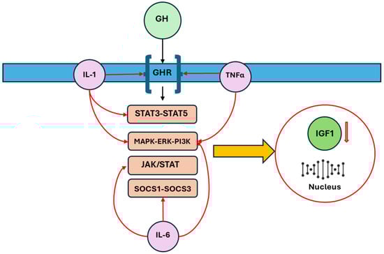 One of the consequences of inflammation is the induction of peripheral resistance to GH, which occurs through two major ways: downregulation of the growth hormone receptor (GHR) and upregulation of members of the suppressor of cytokine signaling (SOCS) family, specifically SOCS1 and SOCS3. These proteins are involved in the negative regulation of GH’s growth-promoting effects, thereby attenuating its action on target tissues [5,20]. Zhao et al. demonstrated that different cytokines have distinct effects on GH signaling [20]. For example, TNF-α and IL-1β were found to inhibit GHR expression with minimal effects on downstream SOCS3, while IL-6 induced SOCS3 expression without affecting GHR expression. In line with these in vitro findings, neutralizing TNF-α and IL-1β in mouse models of inflammation did not significantly modify the expression of SOCS3, which was induced by inflammation, but re-established both GHR and IGF-I expression, both of which had been suppressed by the inflammatory response. On the other hand, neutralizing IL-6 did not affect the GHR expression suppressed by inflammation, but significantly reduced SOCS3 expression and restored IGF-I expression, further suggesting that different cytokines mediate hepatic GH resistance via distinct pathways [20]. Additionally, Denson et al. reported that TNF-α inhibits GHR expression by interfering with the binding of Sp1/Sp3 transactivators to the GHR promoter [21]. Other studies in animal models have shown that GH insensitivity is associated with a decrease in GHR mRNA expression at the receptor level and an increase in SOCS-3 mRNA expression at the post-receptor level, further elucidating the complex regulatory mechanisms involved [22,23]. Additionally, IL-6 may inhibit GH activity by disrupting the JAK/STAT signaling pathway through the expression of SOCS proteins. However, an anomalous expression of STAT5 and STAT3, induced by IL-1β, can interfere with GH signaling. TNF-α, IL-6, and IL-1β also disrupt the MAPK/extracellular signal-regulated kinase (ERK) and phosphoinositide 3-kinase (PI3K) pathways [6,24,25,26,27]. These involved pathways are summarized in Figure 2.