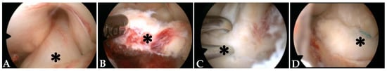 Intraoperative arthroscopic images: (A) front view of a pediatric ACL (*); (B) bottom view of the bony avulsion of ACL insertion (*); (C) reduced avulsion and fixation with percutaneous K-wire (*); (D) control of the reduced TEAF thanks to the pull-out suture technique and the Ti-Cron 5TM in green (*).