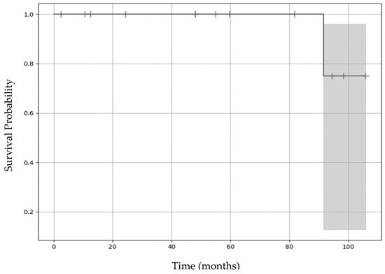 The Kaplan–Meier survival curve for the operated knee showed a high probability of avoiding re-operation throughout the follow-up period, with a slight decrease at the end, reflecting one re-operation. The shaded area represents the confidence interval (Figure 4).