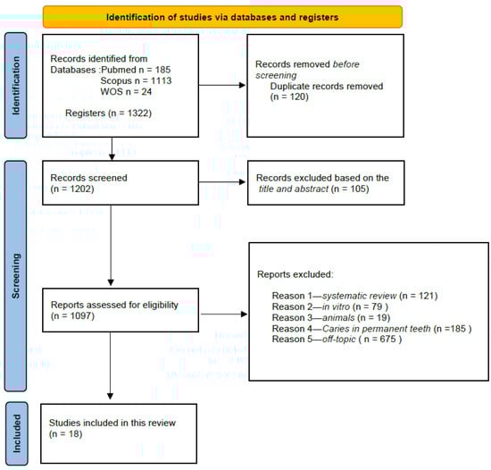 This PRISMA (Preferred Reporting Items for Systematic Reviews and Meta-Analyses) diagram (Figure 2) illustrates a rigorous and systematic selection process to ensure that only relevant studies were included in the final review. A total of 1322 records were identified through electronic database searches, including PubMed (n = 185), Scopus (n = 1113), and WOS (n = 24). Records from other registers were not included. Before screening, 120 duplicate records were removed, reducing the number of records for screening to 1202. The most common reason for exclusion was studies being off topic (n = 675), followed by studies related to caries in permanent teeth (n = 185). Additionally, systematic reviews (n = 121), animal studies (n = 19), and in vitro studies (n = 79) were excluded to focus only on primary research relevant to the effectiveness of restorative dental materials for the atraumatic treatment of caries in deciduous teeth. Ultimately, only 18 studies met all inclusion criteria and were considered relevant for the final analysis. This selection process ensured the robustness and reliability of this systematic review. The selection process and summary of included records are illustrated in Figure 2, while the characteristics of the selected studies are presented in Table 2.