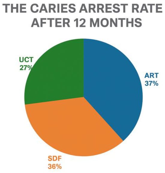 After 12 months, ART demonstrated a caries arrest rate of 87.2%, which was slightly higher than SDF (84.6%) and significantly better than UCT (61.6%).
