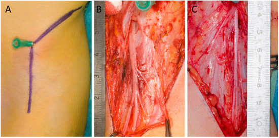 Pelvic exit (simplified type A and B). (A) A modified Smith-Petersen approach was used in all surgeries. The needle marks the ASIS (anterior superior iliac spine). (B) Left side LFCN (lateral femoral cutaneous nerve) (same patient as (A)). The pelvic exit is medial to the ASIS, according to a simplified type A classification. The LFCN exits 23 mm from the SIAS. Thickness: 2.5 mm. Minimum of six branches with straight appearances. (C) Right side LFCN. The pelvic exit is directly cranial to the ASIS according to a simplified type B. The LFCN exits 3 mm from the ASIS. Thickness 5 mm Minimum of six branches with straight appearances.