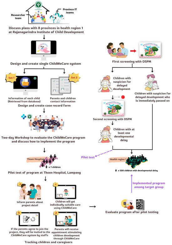 The ChildWeCare system was developed and preliminarily tested on volunteer caregivers of children with developmental delays in the first assessment or at least one domain of developmental delay in the second assessment. System development and pilot testing were conducted in 2023–2024 in eight provinces in northern Thailand (Health Region 1), including Chiang Mai, Lamphun, Lampang, Phrae, Nan, Phayao, Chiang Rai, and Mae Hong Son. The target group for the ChildWeCare program was 1261 children with developmental delays according to the DSPM assessment in this area. After the pilot test, we plan to enroll these children and their parents for further evaluation of the program.