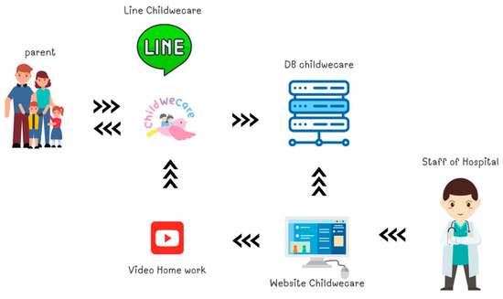 The ChildWeCare system can help to address poor service for children with developmental delays by providing parents with knowledge and suggestions, including training methods for effective stimulation development that are suitable for each child and making or rescheduling hospital appointments at the parents’ convenience. Moreover, the child’s general information and developmental screening history, such as gender, weight, height, and screening results, will be imported from the HDC Service database system. Data on the use of the ChildWeCare system, such as the development levels of the children, the assignments that parents receive, and the results of receiving the service and follow-up care and counseling, will all be updated in the system.